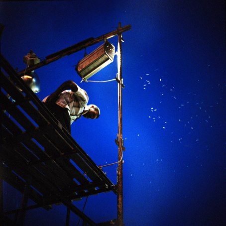 Moths dart in the beams of a floodlight being erected on scaffolding to illuminate a sports stadium in Khan Yunis.