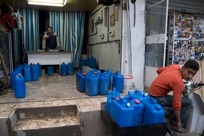Distribution of drinking water at the refugee camp of Shatila in Beirut. “Palestinian refugee camps are like islands in the middle of the sea,” says Nohad Hamad, of Association Najdeh, a women’s organisation operating in Lebanon’s twelve Palestinian refugee camps.