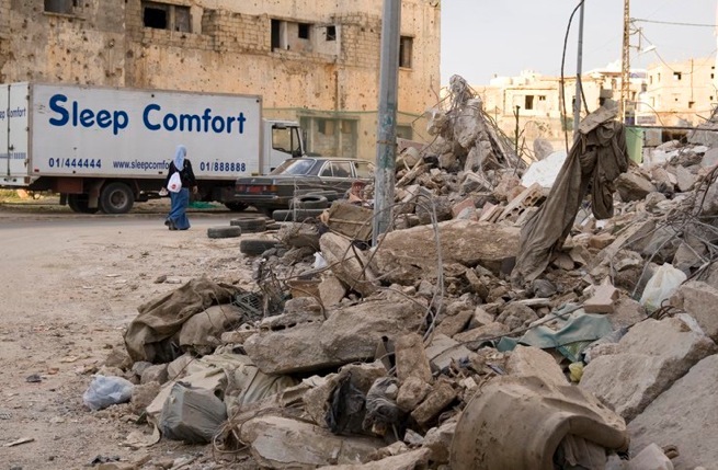 Southern Beirut. Buildings pockmarked by civil war clashes, meet rubble created by Israeli bombing in the summer of 2006.
