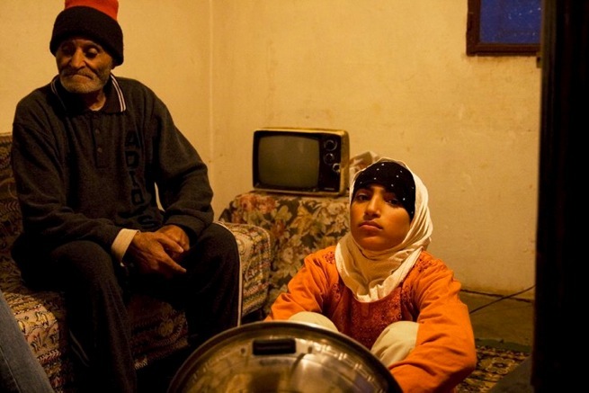 13 year old Batoul trying to keep warm with her father Mohammed during the bitter Beqaa valley winters.