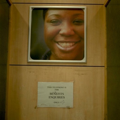 Man overheard on courtesy telephone marked 'Benefits Enquiries Only' at Jobcentre Plus.