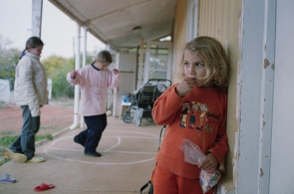 Sandy, five, with her sister and cousin on their front porch. The prefabricated housing at Richmond Village was brought over from the Suez in the 1950s and its roofs are made of asbestos. The British had begun demolishing them in 2000, but then decided to house the unrecognised refugees here temporarily.