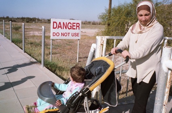 Four years ago the British authorities signed a Memorandum of Understanding with Cyprus that in the case of future migrant arrivals into the Sovereign Base Areas (SBA), Britain would pay Cyprus to process asylum claims made to the SBA. The British authorities then began taking measures to ‘encourage’ the remaining families in Richmond Village to move into Cyprus. They cancelled the English teacher they had provided for the children, demolished some of the housing, transferred healthcare provision to the Cypriot authorities and removed a play area of swings and a slide. Here Ahin takes her daughter for a walk on the old playground.